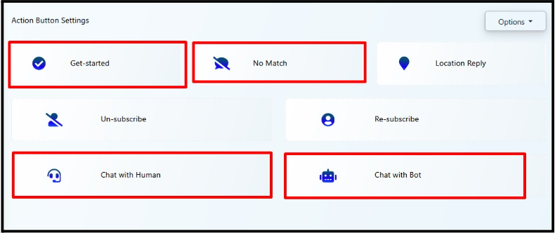 The Action Button Settings empowers you with a quick and easy way to manage your core chatbot actions. With just a few clicks, you can greet users, route messages to agents, manage subscriptions, and ensure every user gets a meaningful response.