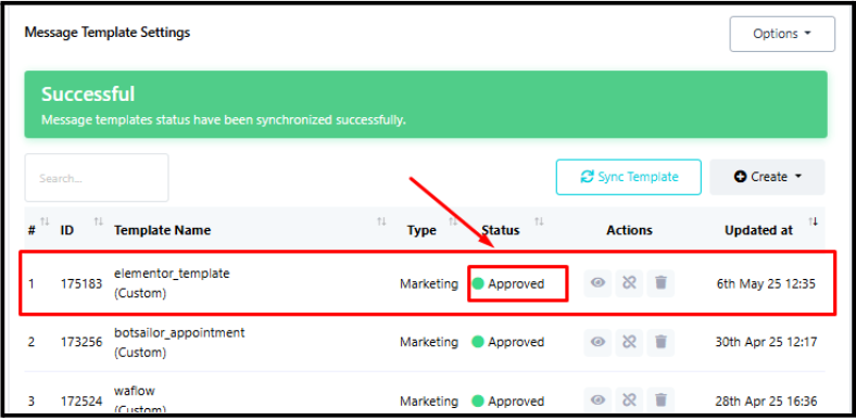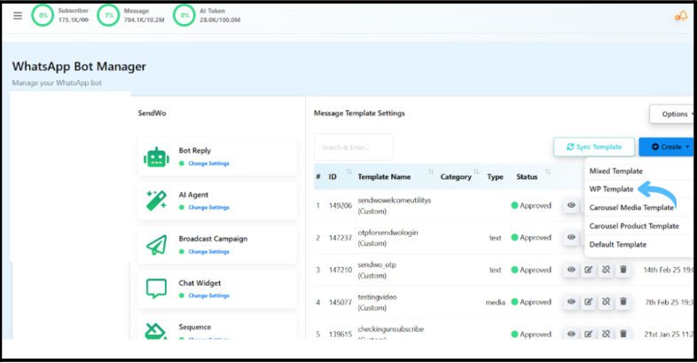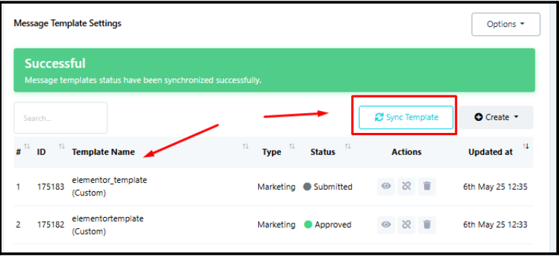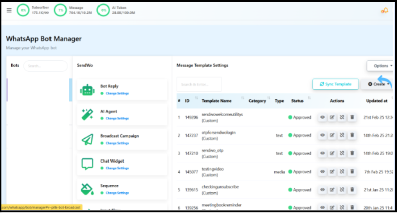 Clicking the sync button in the WhatsApp template section instantly fetches and updates your existing templates from the WhatsApp server or connected platform, ensuring you see the latest status and ready-to-use versions for communication flows.