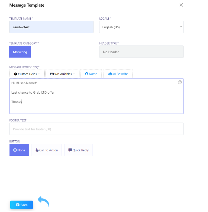 In SendWo’s template form, you can add one CTA button or one Quick Reply button as needed.