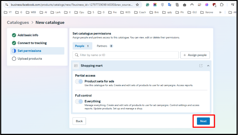 7. Ensure you grant Full Control permissions under “Product sets for ads,” then click on Next.