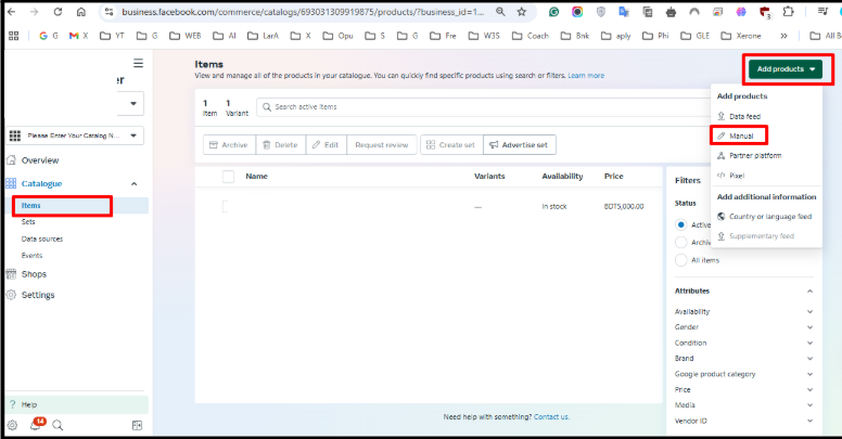 9. Inside your catalog, click first on View Catalog > Add Items to upload product details manually, which includes product names, images, pricing, and descriptions.