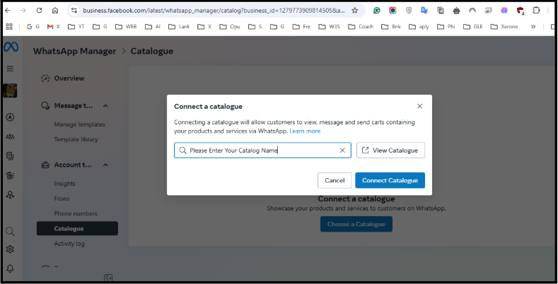 c. Choose your catalog and click Connect Catalog. This will link your WhatsApp Business number.